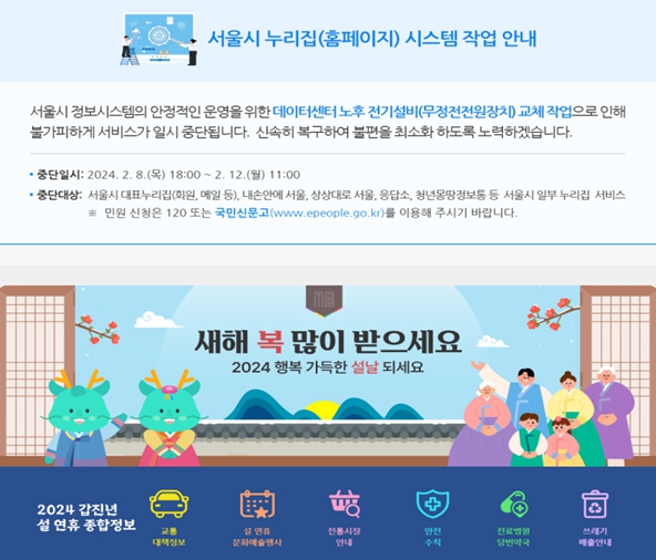 서비스 중단이 설 연휴인 만큼 시민이 서울시 누리집에 접속했을 때 미리 구축한 임시 누리집으로 이동시켜 교통 대책정보, 설연휴 문화예술행사, 전통시장 안내, 안전 수칙, 진료병원 당번약국, 쓰레기 배출안내 등 시민에게 필요한 필수정보를 제공할 예정이다.