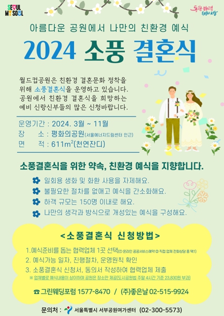 지난해 월드컵공원에서 진행한 예식은 총 16팀으로 평균적인 예식비용은 1천만 원이었으며, 모바일 및 재생용지 청첩장부터 다회용기 도시락 피로연까지 환경을 고려하여 다양한 방법으로 진행됐다.