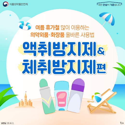 [뉴스힘=박노신 기자] 식품의약품안전처는 여름 휴가철 야외 활동 시 자주 사용하는 의약외품 ‘액취방지제’와 화장품 ‘체취방지제’의 올바른 사용방법과 주의사항을 안내한다고 밝혔다.