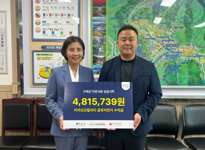[뉴스힘=주신락 기자] 카카오모빌리티가 지난 9월 30일 구례군과의 공유자전거 이용 활성화를 위한 업무 협약의 일환으로 공유자전거 수익금 4,815,739원을 구례군에 기탁했다고 밝혔다.