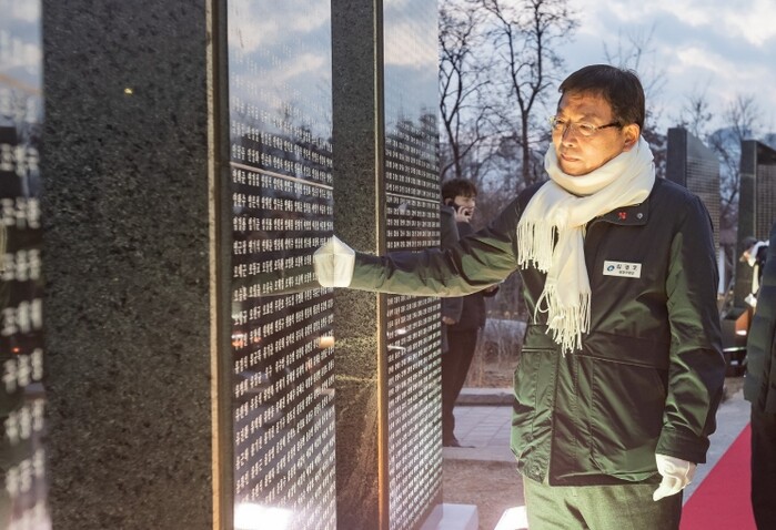 | ▲ 2024년 12월 광진 무궁화정원에 조성된 참전유공자 명비를 둘러보는 김경호 광진구청장 |