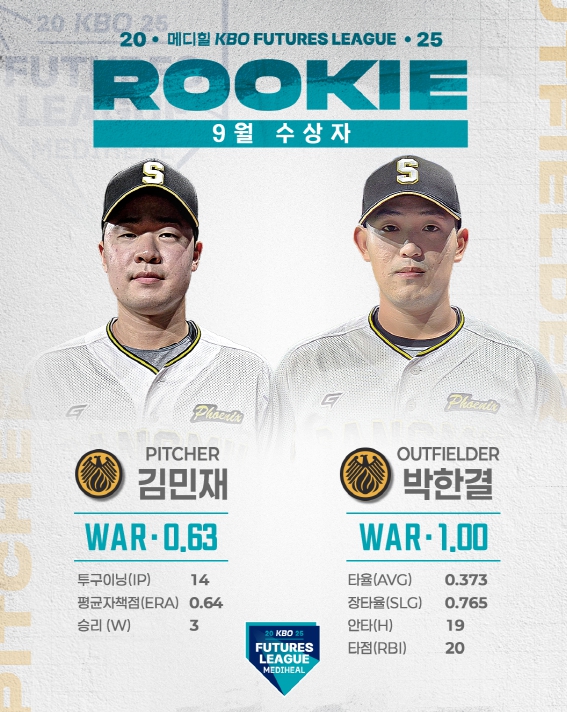 [뉴스힘=박노신 기자] 2025 메디힐 KBO 퓨처스리그의 9월 퓨처스 루키상 수상자로 투수 부문에는 상무 김민재가 WAR 0.63, 타자 부문에는 상무 박한결이 WAR 1.00을 기록하며 각각 선정됐다.