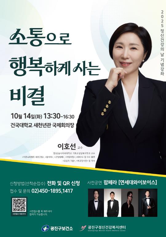 [뉴스힘=박노신 기자] 광진구는 오는 10월 14일 ‘정신건강의 날(매년 10월 10일)’을 맞아 건국대학교 새천년관 국제회의장에서 광진구정신건강복지센터 주관 기념 강좌를 개최한다.