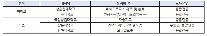 바이오 특성화대학에는 △성균관대학교, △아주대학교를 선정했으며, 로봇 특성화대학으로는 △국립창원대학교, △광운대학교, △인하대학교를 선정했다.