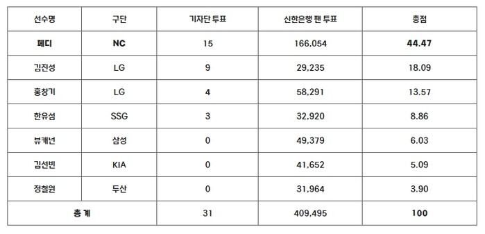 기자단 투표 총 31표 중 15표(48.4%), 팬 투표 409,495표 중 166,054표(40.6%)로 총점 44.47점을 받은 페디는 기자단과 팬들 모두에게 가장 높은 지지로 개인 첫 번째 월간 MVP로 선정되는 명예를 안았다.