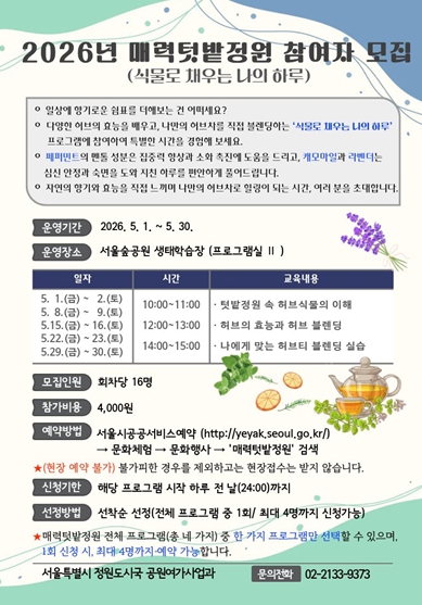 ‘매력텃밭정원’ 프로그램의 자세한 일정과 내용은 서울특별시 공공서비스예약을 통해 확인할 수 있으며, 각 프로그램 시작 2주 전 월요일부터 선착순 신청할 수 있다.
