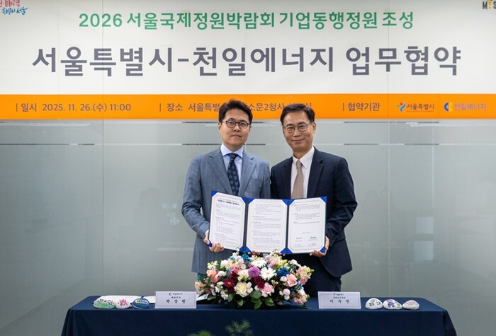 [뉴스힘=박노신 기자] 서울시는 2026년 서울숲에서 개최되는 서울국제정원박람회 내에 기업동행정원 조성을 위해 ESG 경영에 힘쓰고 있는 천일에너지와 11월 26일 업무협약을 체결했다.