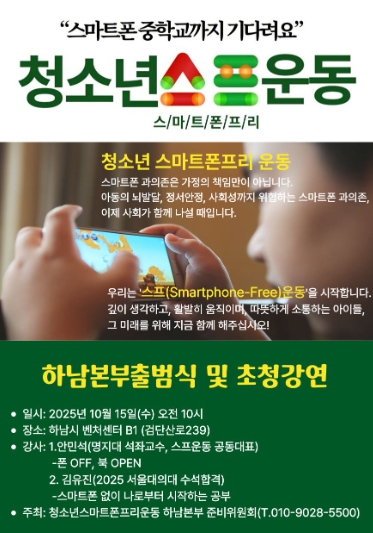 [뉴스힘=박노신 기자] 오는 15일 오전 10시, 하남시 벤처센터에서 ‘청소년 스마트폰 프리 운동(Smartphone-Free)’ 하남본부 출범식을 갖는다.