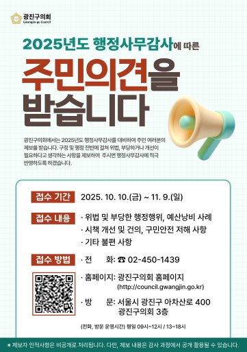 [뉴스힘=박노신 기자] 광진구의회가 오는 11월 17일부터 진행되는 ‘2025년도 행정사무감사’를 앞두고 주민 의견을 10월 10일부터 11월 9일까지 총 31일간 접수한다.