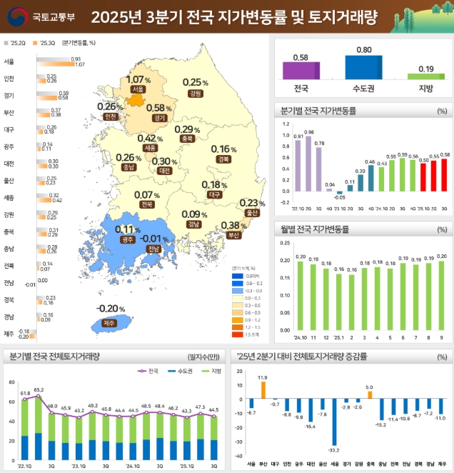[뉴스힘=박노신 기자] 국토교통부와 한국부동산원(원장 손태락)은 '25년 3분기 지가변동률 및 토지거래량을 발표했다.