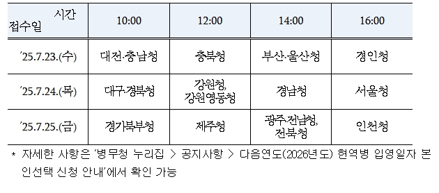 지역별로 접수 일정이 다르고, 선착순 마감되므로 사전에 병무청 누리집 공지사항을 확인하여 본인의 관할 지방병무청과 접수일시, 유의사항을 미리 알아두어야 한다.