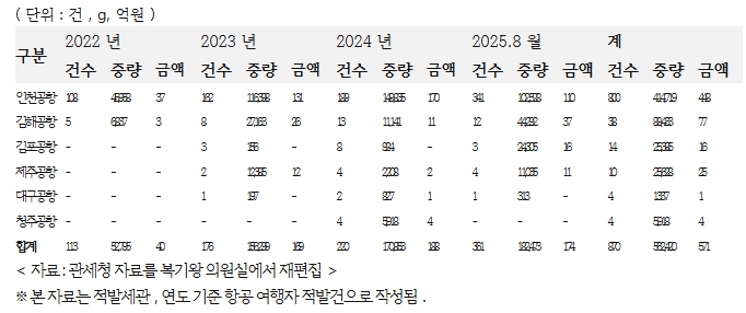 복기왕 의원이 관세청으로부터 제출받은 자료에 따르면 , 인천공항은 2022 년 108 건에서 2024 년 189 건으로 2 배 가까이 늘어나며 전체 적발 건수의 약 85.9% 를 차지했다 . 같은 기간 김해공항은 5 건에서 13 건으로 3 배 증가했고 , 2023 년부터는 김포 · 제주 · 대구 · 청주공항에서도 적발 사례가 이어지며 지방공항 전반으로 확산됐다 .