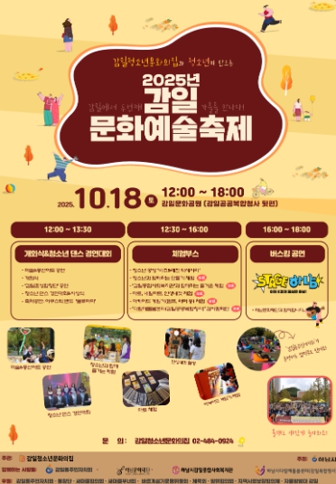 [뉴스힘=박노신 기자] 하남시 감일청소년문화의집은 오는 10월 18일 오후 12시부터 18시까지 감일문화공원(감일공공복합청사 뒷편)에서 '제2회 감일문화예술축제'를 개최한다.