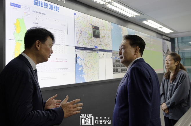 대통령은 ‘서울인천광역응급의료상황실’과 ‘중앙응급의료상황실’에 잇따라 들러 24시간 실시간 환자와 구급대원, 병원을 연결하고 상황을 파악 중인 의료진 및 직원들과 일일이 악수하며 "수고 많으세요"라고 말하며 격려했다. 이어 어느 지역의 응급실이 포화돼 있는지 보여주는 ‘응급의료 현황판’에 부산 지역이 응급의료 어려움을 보여주는 붉은 표시가 뜨자 대통령은 보건복지부 장관에게 "부산시장과 통화해 어려움이 있는지 파악해 보라"고 현장에서 바로 지시하기도 했다.