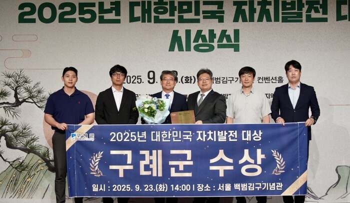 [뉴스힘=박노신 기자] 전남 구례군은 9월 23일 서울 백범김구기념관에서 열린 ‘2025년 대한민국 자치발전 대상’ 시상식에서 기초자치단체 부문 대상을 수상하는 영예를 안았다. 전남 지자체 중에서는 구례군이 유일하게 수상했다.