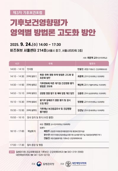 [뉴스힘=박노신 기자] 질병관리청은 대한예방의학회(회장 홍영습)와 함께 '3차 기후보건포럼'을 9월 24일 오후 2시, 비즈허브 서울센터(서울시 중구 소재)에서 개최한다.