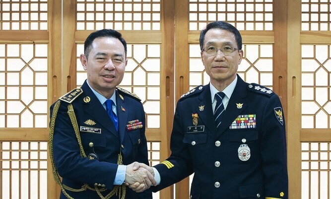 | ▲ 유재성 경찰청장 직무대행과 체아 페우 캄보디아 경찰청 차장 〔사진=경찰청 제공〕 |