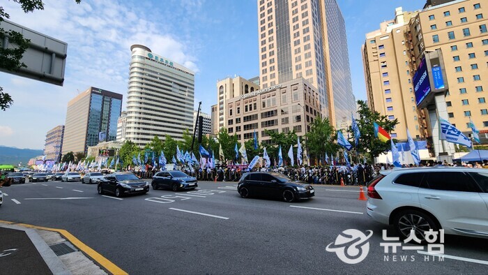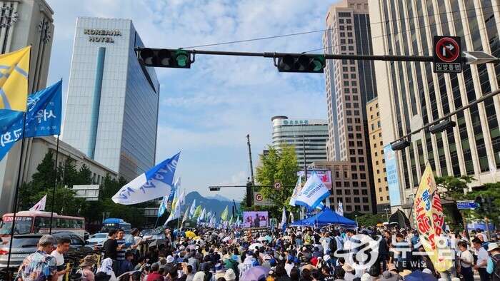 ▲ 8월 26일 오후 청계광장 입구 교차로 일대에서 후쿠시마 원전 오염수 방류 규탄 집회에 참석한 시민들